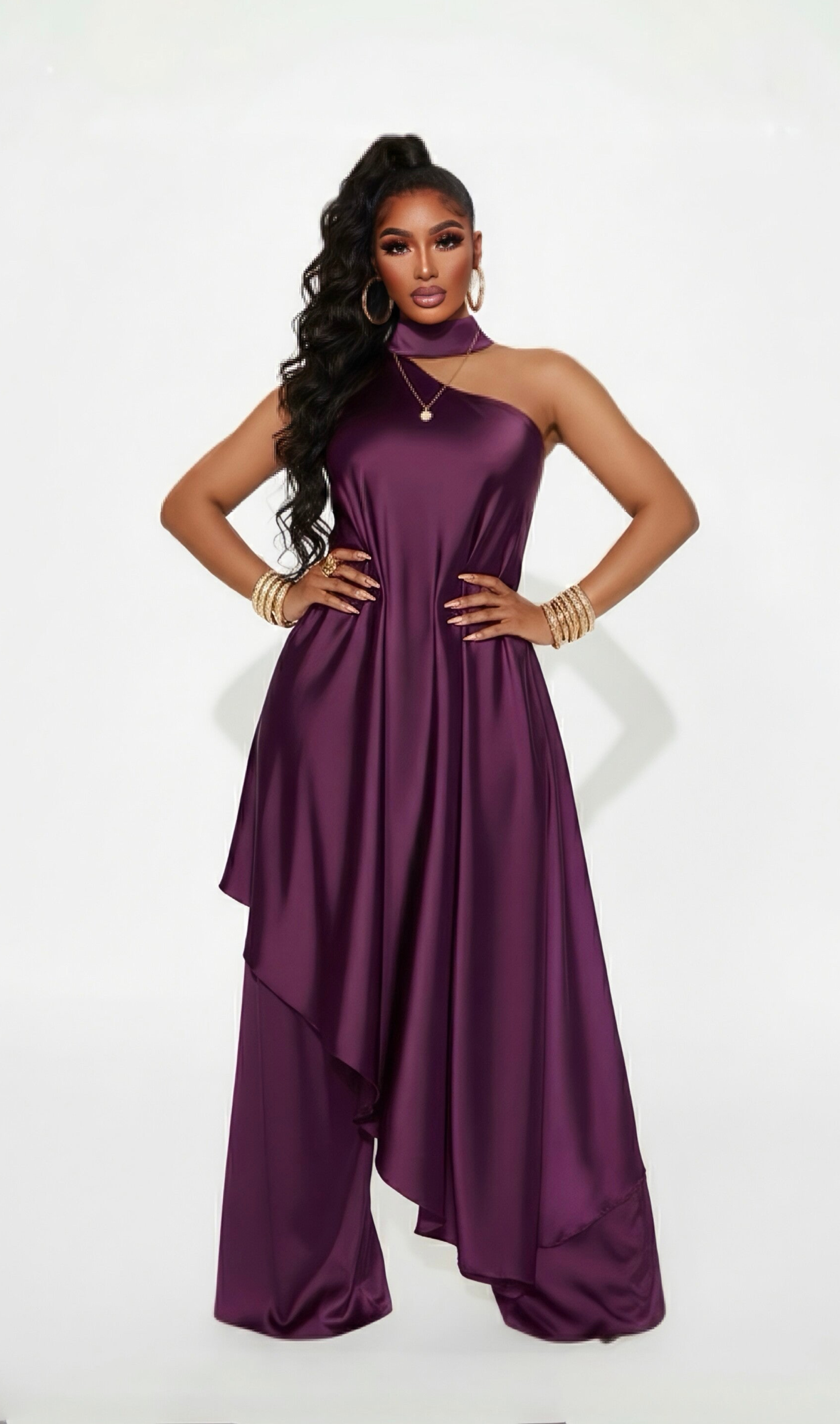 ZAFIRA — Satin one-shoulder, wide leg pants set - Eggplant Purple.