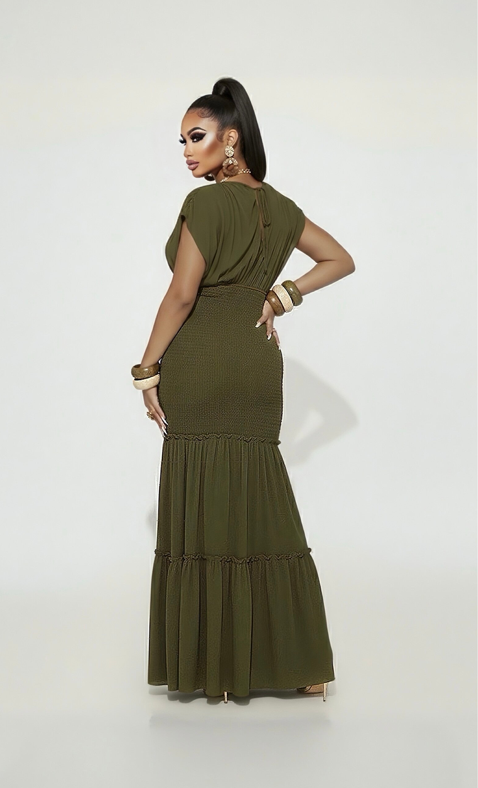 OLIVARA — Smocked Waist Tiered Chiffon Maxi Dress – Olive Green