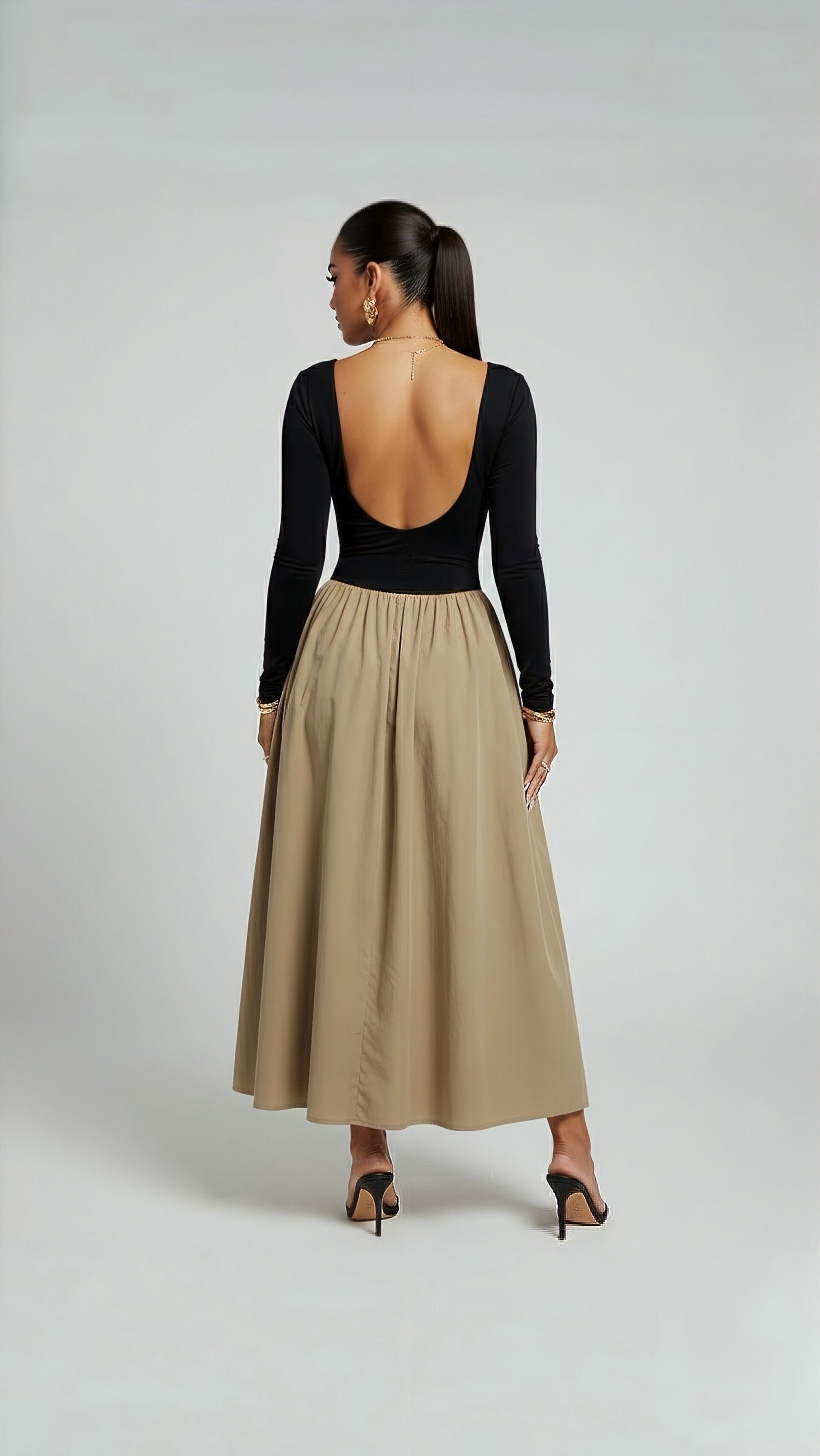 Elegant with a modern edge — LOREA is an open-back, long-sleeve midi dress designed to flatter with a sleek drop-waist silhouette. The flowing contrast skirt and refined open-back detail create a sophisticated look perfect for dinners, events, and elevated day-to-night styling.