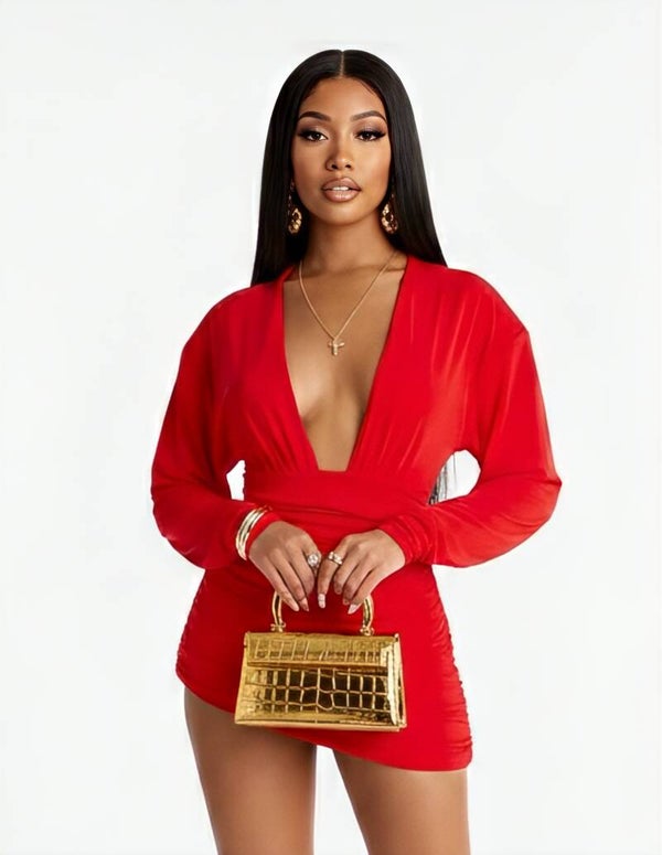 KARESSA – Deep V Long Sleeve Mini Dress (Red)