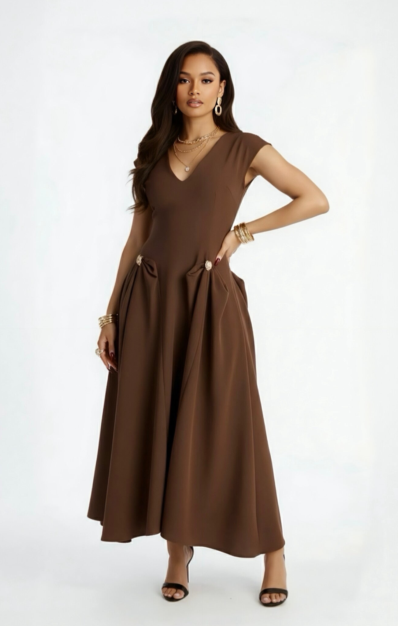 In a rich chocolate tone, this sculpted midi dress features a flattering V-neckline, structured waist, and soft pleated detailing that flows into an elegant, graceful silhouette.